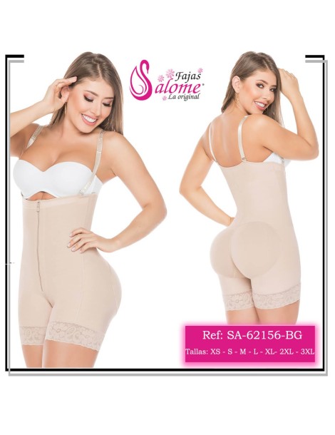 Faja Salome corta con efecto moldeador, con tiras removibles, y cremallera frontal que facilita su uso cuenta con zona de encaje con silicona en la pierna para lograr adherencia al cuerpo, además es ideal para uso diario ya que al comprime y moldea tu cuerpo sin dejar de ser comoda. Elaborado en el exterior con tela en powernet y en el interior está diseñada con franela lycra y algodón, además del componente hipoalegrenico, excelente sistema de moldeo en abdomen y cintura, y su exclusivo realce en glúteos. Disponible en negro y beige.
