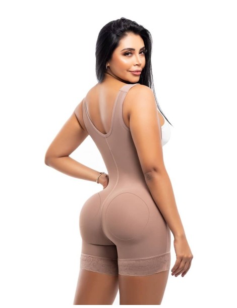 Faja de uso diario y postquirurgica, sin manga y de pierna corta. Cuenta con un cierre central de tres posiciones. Broches en hombros para un mayor ajuste. Tiene el busto y la entrepierna abiertos. Se recomienda usarla debajo de entrerizos y vestidos para lograr una silueta mas estilizada. Fabricada con nailon y Powernet hipoalergenicos.